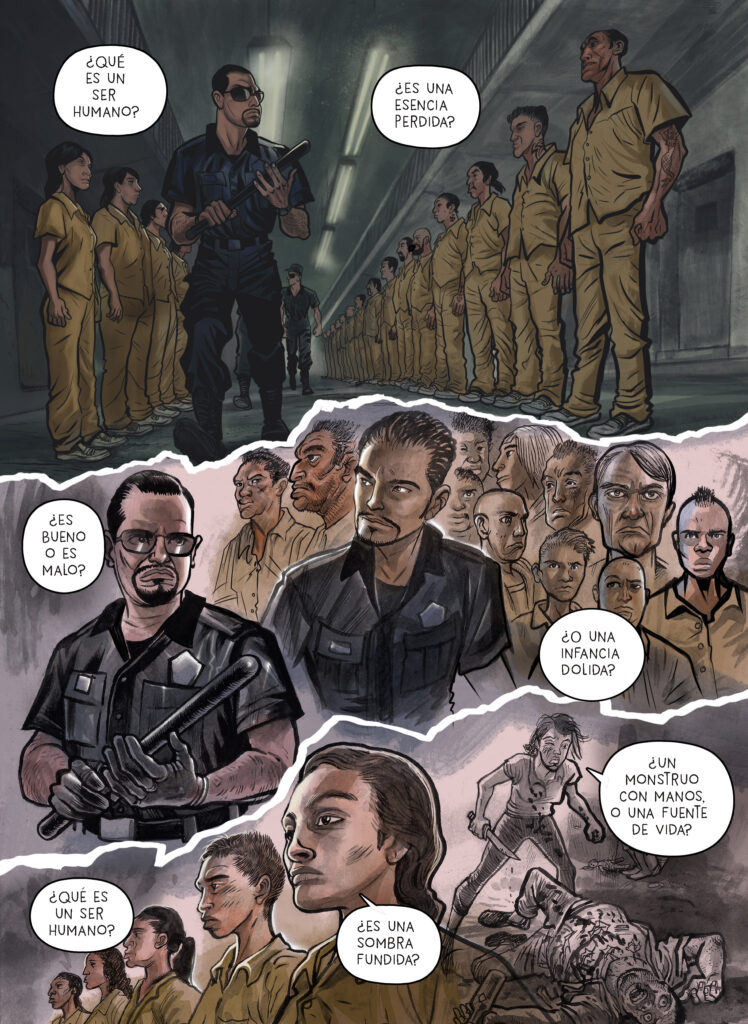 “¿Qué es un ser humano? / ¿Es una esencia perdida? / ¿Es bueno o es malo? / ¿O una infancia dolida? […] ¿Es una sombra fundida? ¿Un monstruo con manos, o una fuente de vida? […] ¿Es verdad o es mentira? ¿Guardián en los años… o un verdugo en la cima? […] ¿Es una voz que arrodilla? / ¡¿Es luz en los sabios?! / ¿Extinción, muerte o vida? / ¡Son cuerpos castrados! / ¡Forjados a heridas! / ¡No, no son malos! / ¡Son sólo maltratos! / ¡No, no son malos, son abandonados! / ¡No! / ¡No son malos! / ¡Son temor, son dolor!”