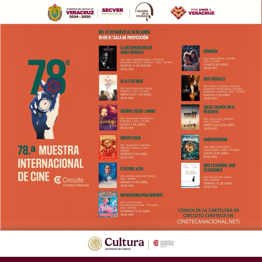Veracruz, Veracruz — 24 de marzo de 2026.— El Gobierno del Estado de Veracruz, a través de la Secretaría de Cultura (SECVER) y en el marco del programa Por Amor a Veracruz, trae a la entidad la 78 Muestra Internacional de Cine de la Cineteca Nacional. Once títulos cinematográficos de producción reciente —y un clásico imprescindible— se proyectarán de manera gratuita en la Sala de Proyección del Ágora de la Ciudad, a partir del próximo 31 de marzo y hasta el 10 de abril, todos los días a las 18:00 horas.