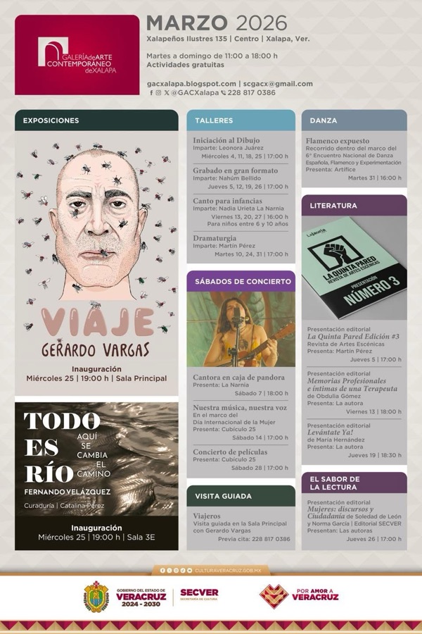 Xalapa, Ver. La Galería de Arte Contemporáneo de Xalapa (GACX) presenta una cartelera especial para marzo con exposiciones, talleres, música, literatura y danza, consolidándose como uno de los espacios más activos de la vida cultural veracruzana.