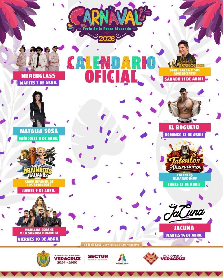 Alvarado, Veracruz.– El municipio de Alvarado se prepara para celebrar la Feria de la Pesca y el Carnaval 2026, que se llevará a cabo del 7 al 14 de abril, con una cartelera artística y cultural que promete atraer a visitantes de toda la región. De acuerdo con el calendario oficial, el evento ofrecerá una amplia variedad de espectáculos musicales